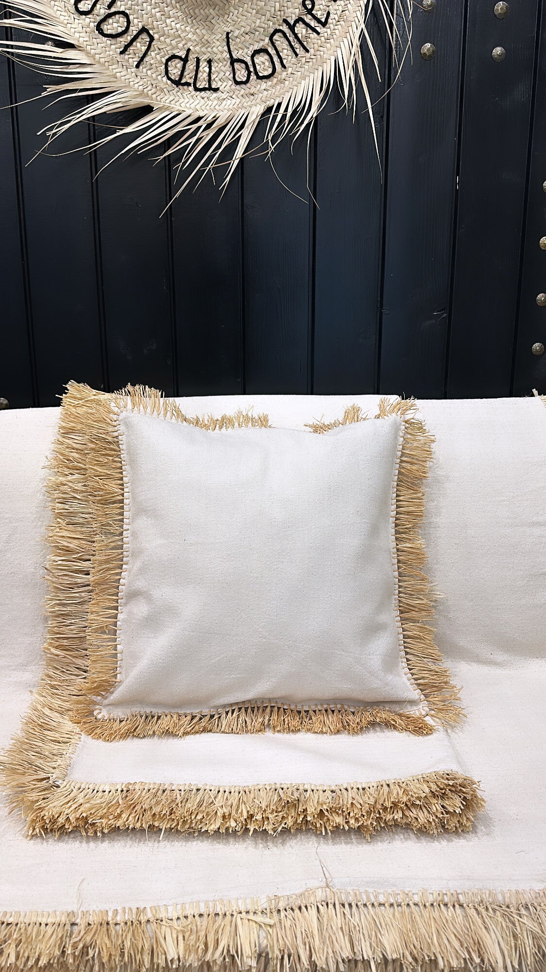 Coussin en coton et raphia .