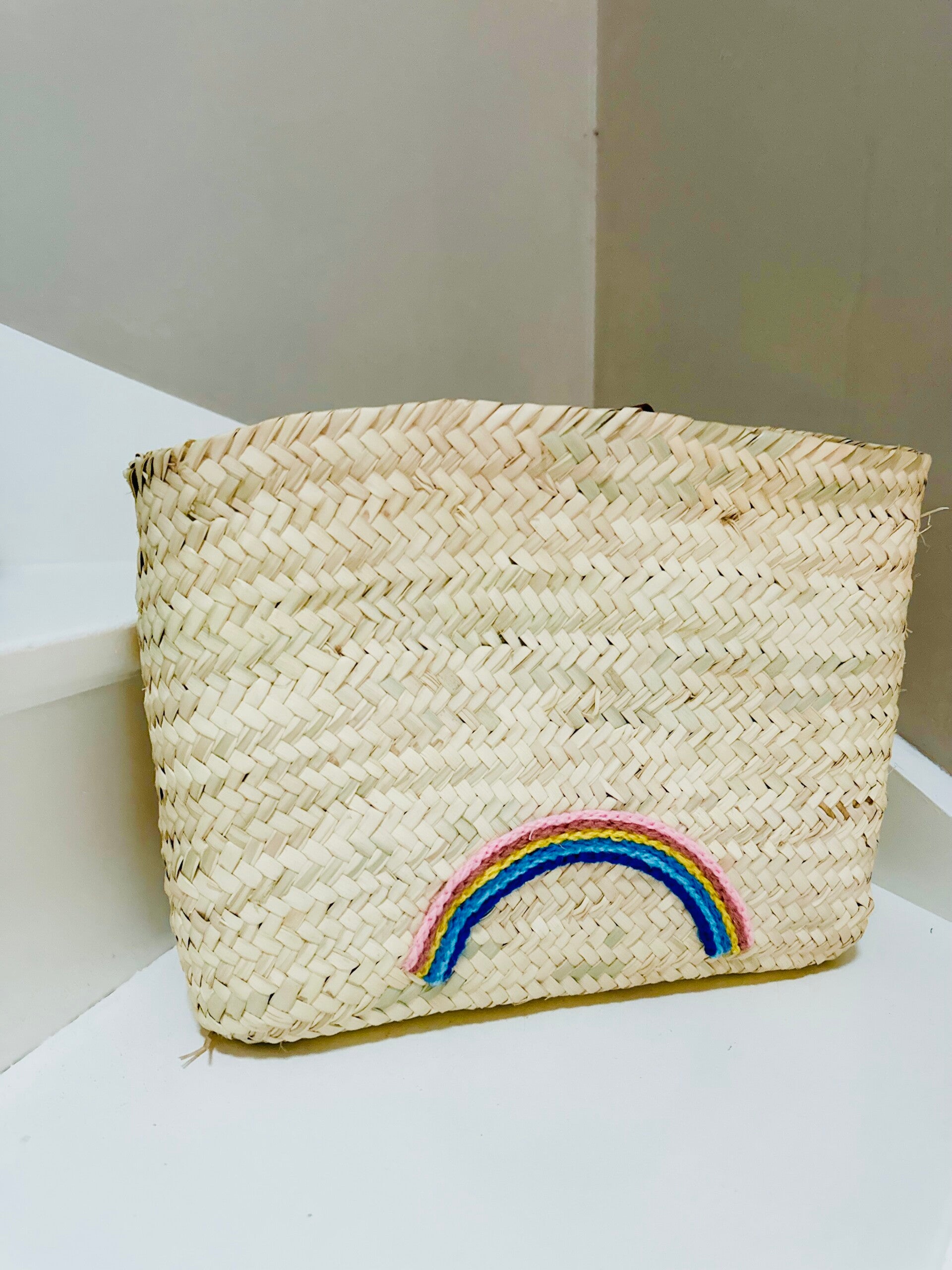 Panier à vélo en feuilles de palmier tressé et anses en cuir de chameaux