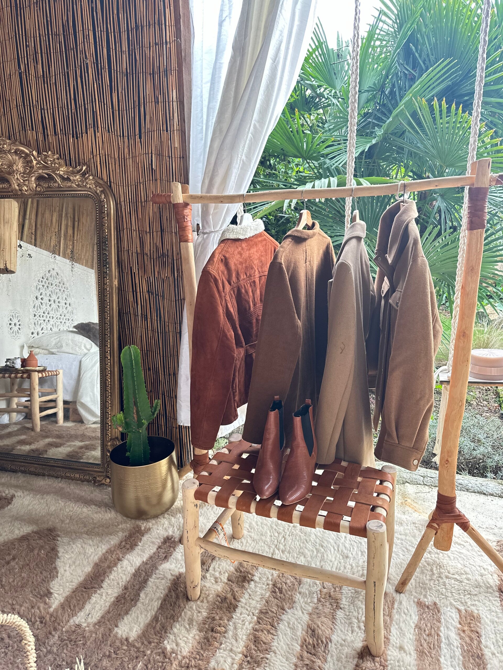 Banc en cuir de chameau et bois d'eucalyptus.