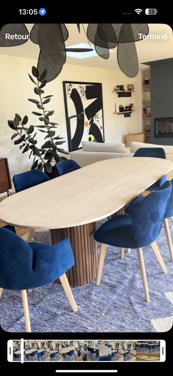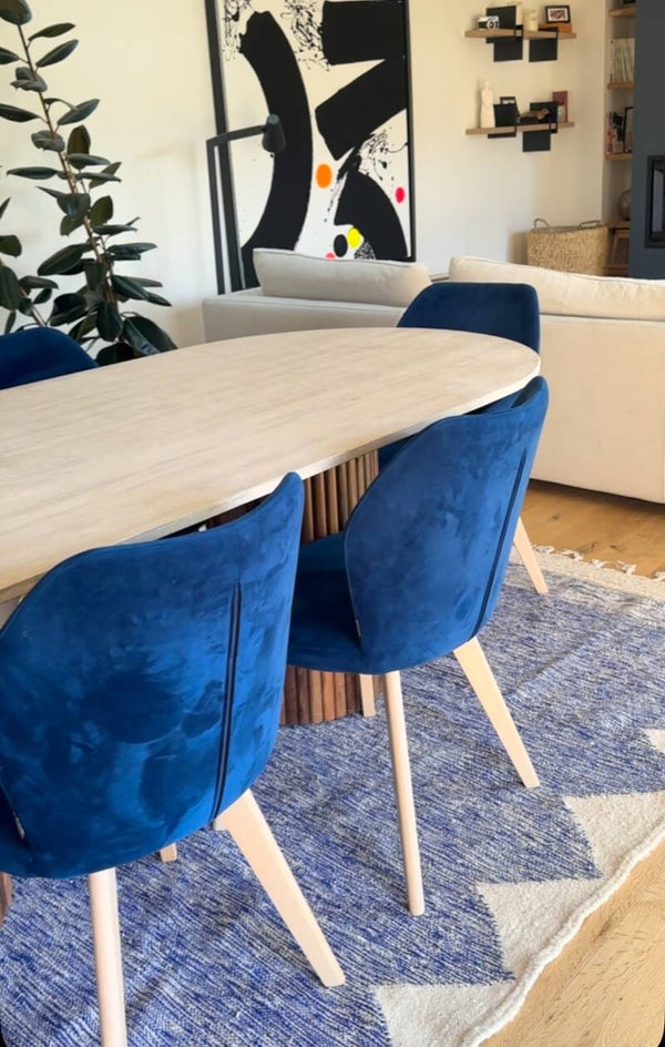 La table présente un plateau en travertin avec des pieds en bois rainuré, ce qui lui donne un design élégant et chaleureux. Elle s’intègre bien dans cette salle à manger au style moderne et naturel, avec des chaises en velours bleu et un tapis texturé qui ajoute du contraste. Vous cherchez des idées pour compléter la déco ou des conseils sur l’entretien du travertin ?