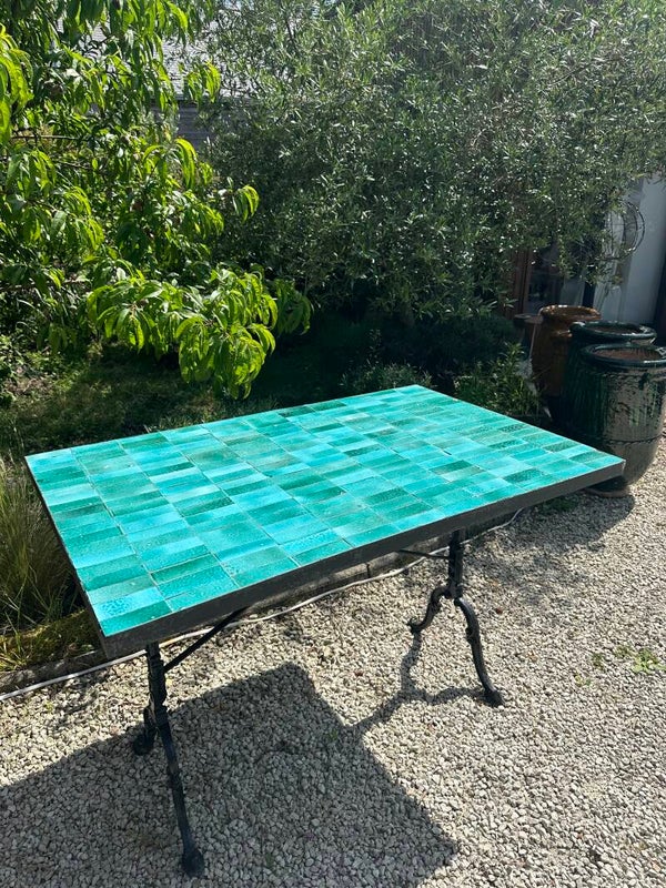 Un souffle d’évasion, comme un clin d’œil à la Méditerranée. Cette table en zellige turquoise capte les reflets du ciel et de la mer pour créer une ambiance fraîche et inspirante. Son plateau en carreaux artisanaux et ses pieds en fonte noire lui offrent élégance et durabilité.