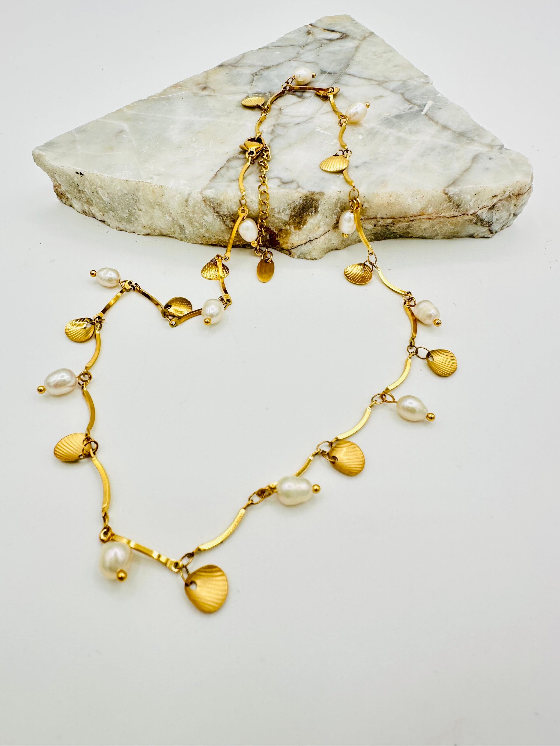– coquillages dorés & perles blanches