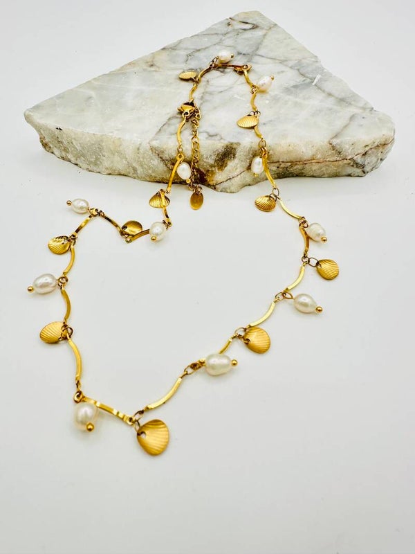 Ce collier mêle la chaleur de l’acier doré, la douceur des perles blanches et l’esprit libre des coquillages, pour une pièce lumineuse qui évoque l’été, la mer et la liberté.