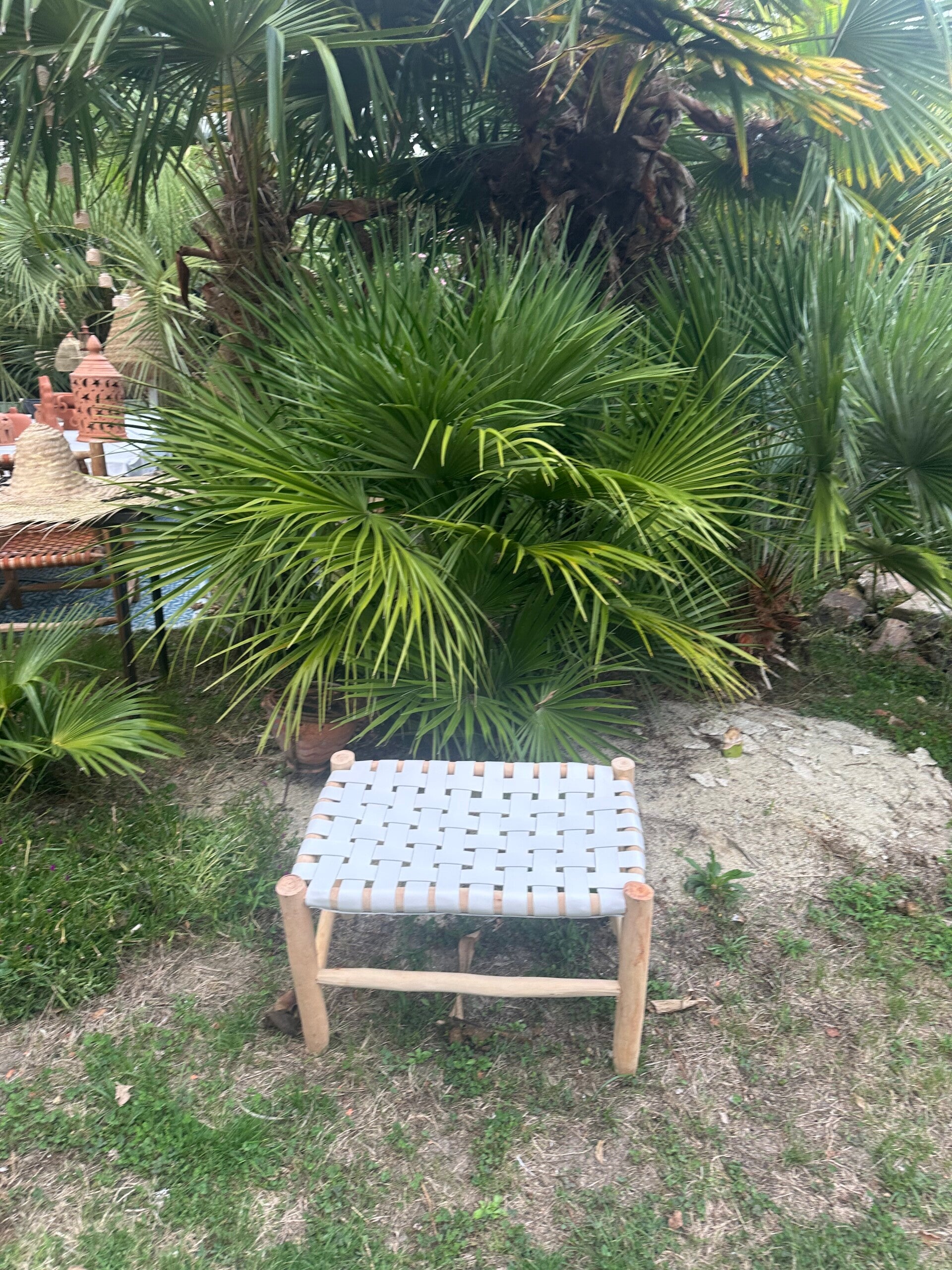 Fabriqué à la main, ce banc marie la robustesse naturelle du bois d’eucalyptus à la douceur du cuir blanc tressé. Une pièce à la fois brute et délicate, qui incarne parfaitement l’esprit bohème chic de Makasbah.