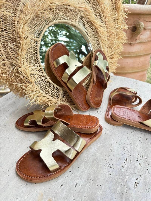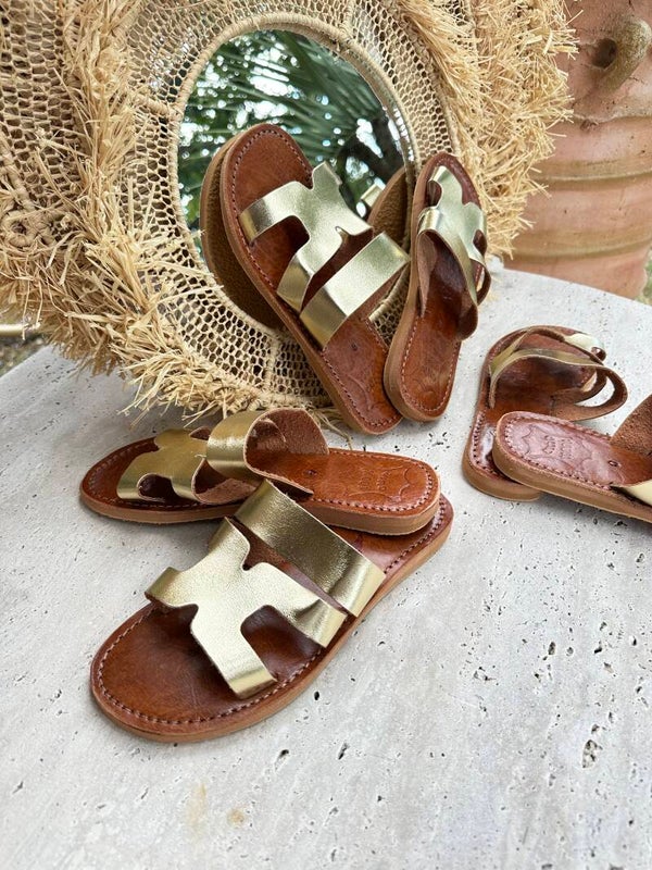 Sandales marocaines dorées en cuir – Fait main