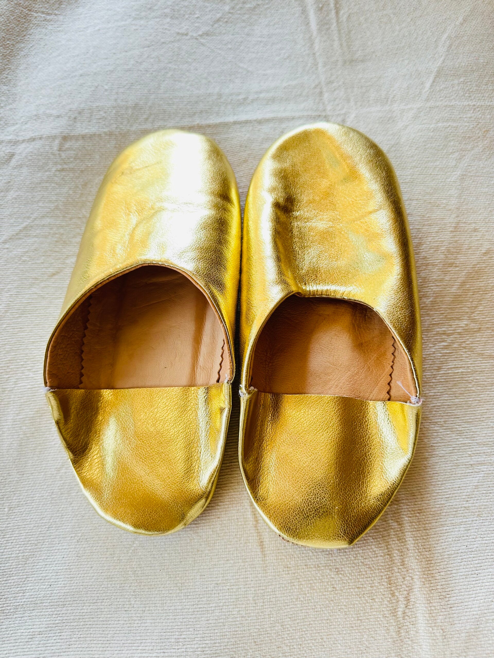 Raffinées et lumineuses, nos babouches marocaines dorées sont entièrement fabriquées à la main dans les ateliers traditionnels du Maroc.