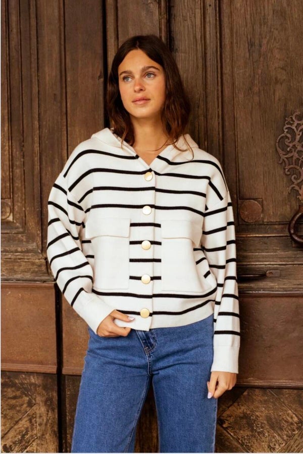 Le Cardigan Alice allie confort et style décontracté. Ses rayures colorées et sa capuche intégrée apportent une touche bohème et moderne à vos tenues. Léger et facile à porter, il se superpose parfaitement sur un pull ou un t-shirt pour un look cosy au quotidien.