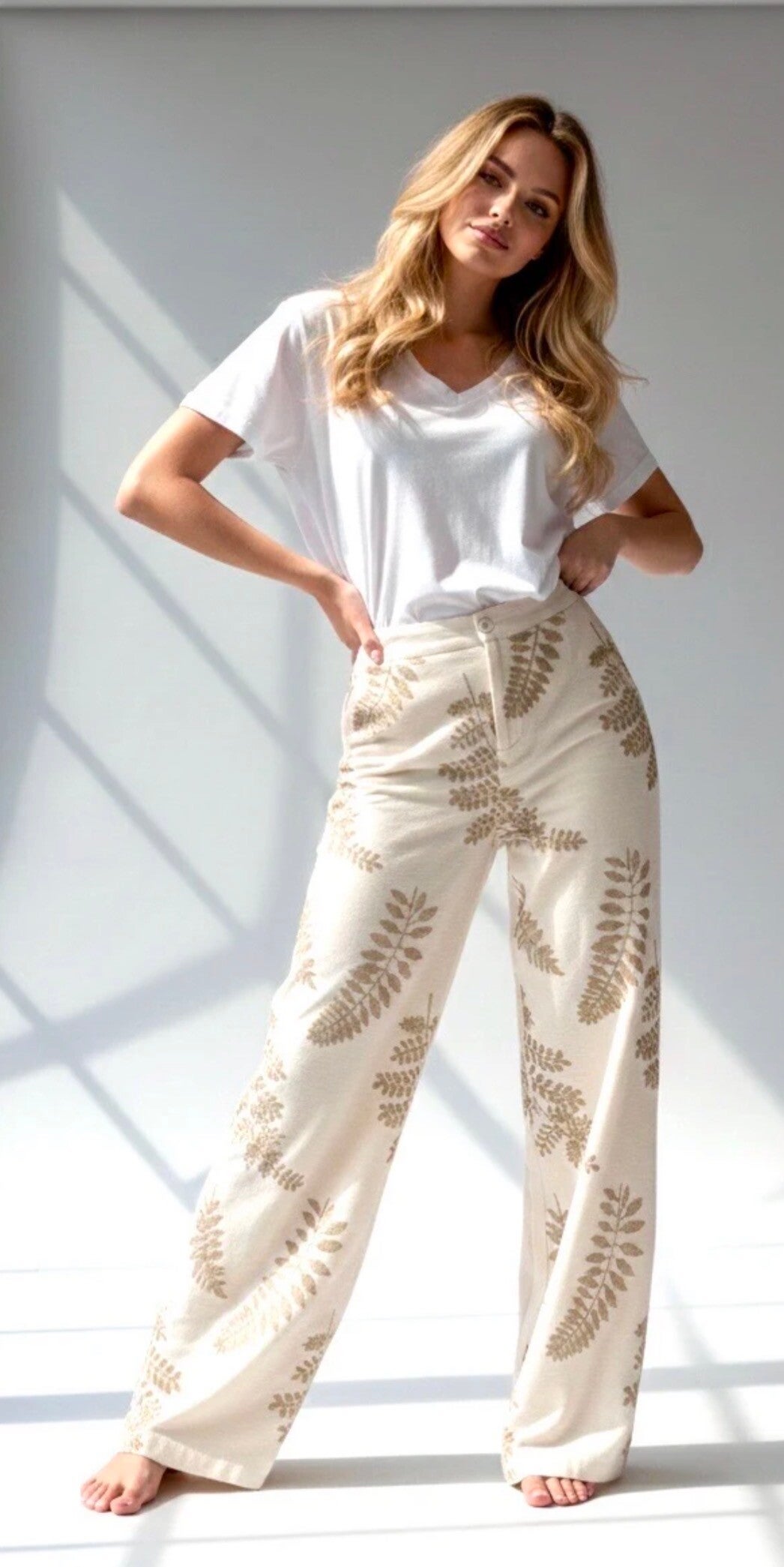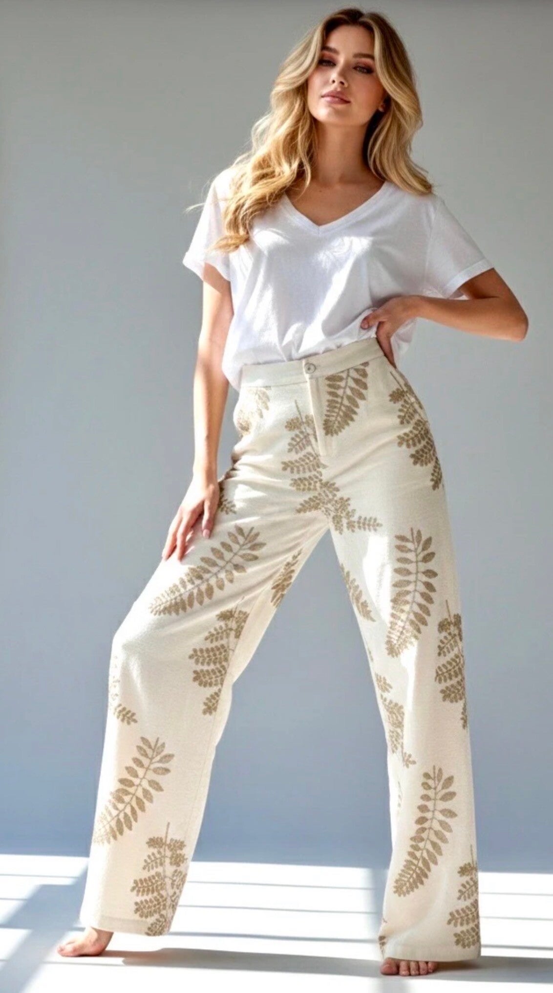 Pantalon taille haute à coupe large avec fermeture boutonnée à l’avant et imprimé feuillage raffiné, offrant une silhouette fluide et féminine.